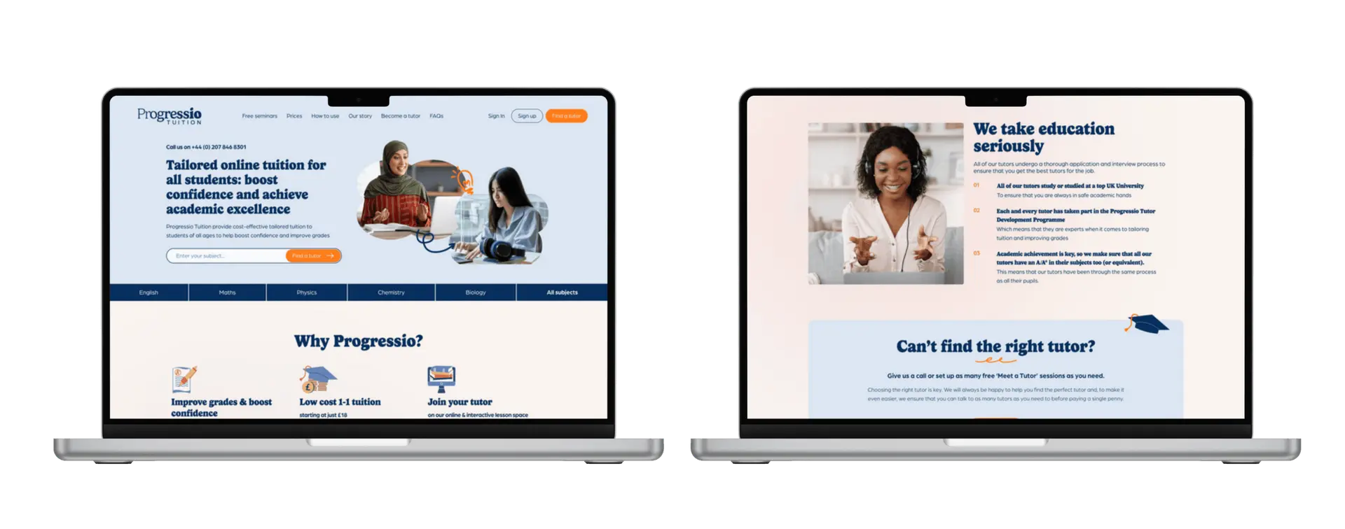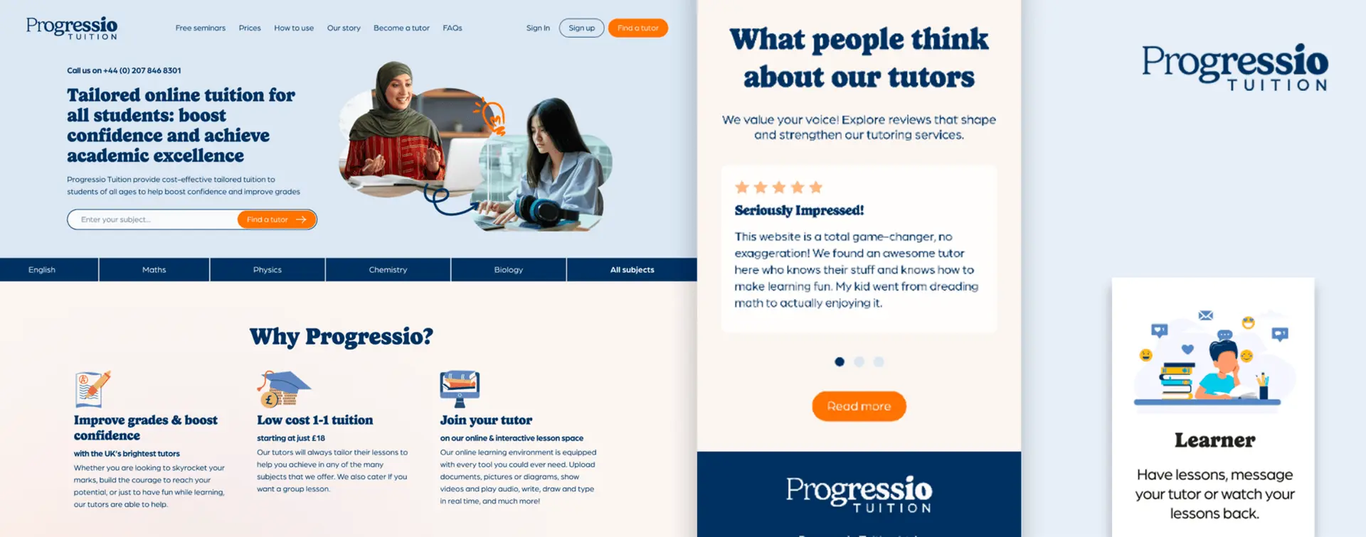 The project culminated in a beautifully designed, highly functional website tailored to the needs of Progressio Tuition’s diverse audience. The platform seamlessly integrates the requirements of learners, parents, and tutors, ensuring a superior user experience and CAD continues to provide ongoing support and maintenance for Progressio's new website.